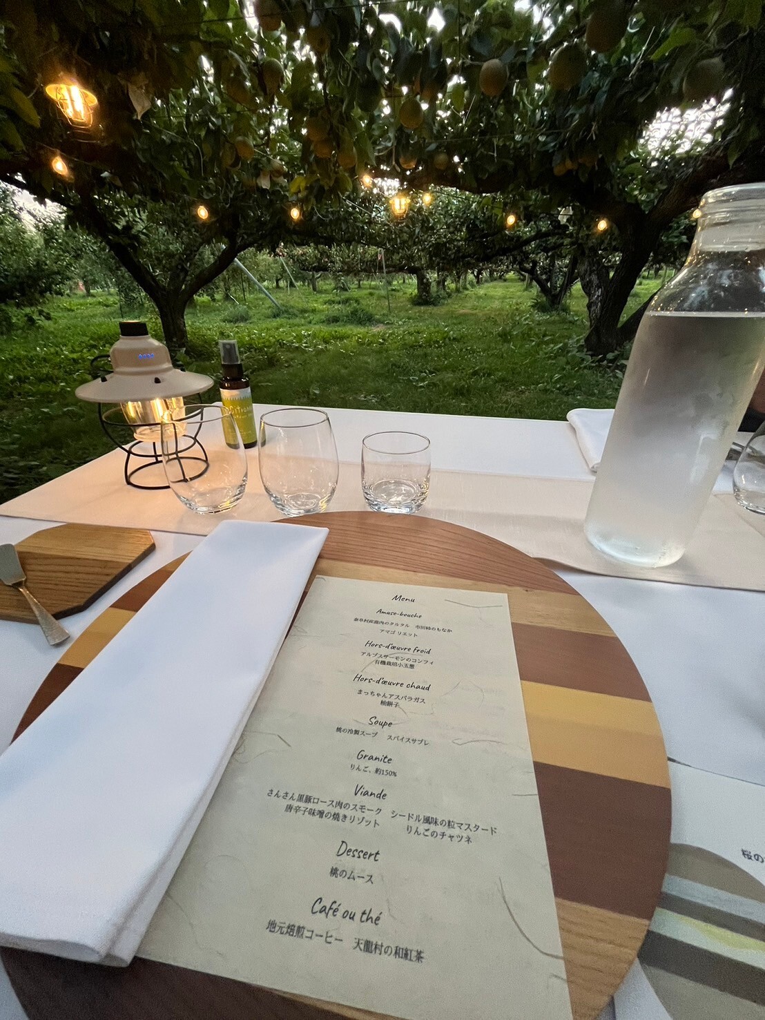 今回、松川町が運営する「オーチャードレストラン」の利用と併せてお邪魔しましたが、素晴らしいもてなしと環境でした。リンゴや梨の畑の下で、オーナーによる醸造所ツアーを皮切りにイタリア人のクリスティーナさんによるセンスあるテーブルセッティングでシードルやワインとのペアリングディナーを楽しみました。大阪や京都の一流ホテル出身のシェフによる果物と地元野菜をふんだんに使ったフレンチも秀逸。日本とは思えない素晴らしい一夜でした。また季節を変えてお邪魔したいと思います。夜は涼しく、思ったほど虫も多くなく快適な車中泊で流星群も楽しめました。控えめに言って「最高」です!